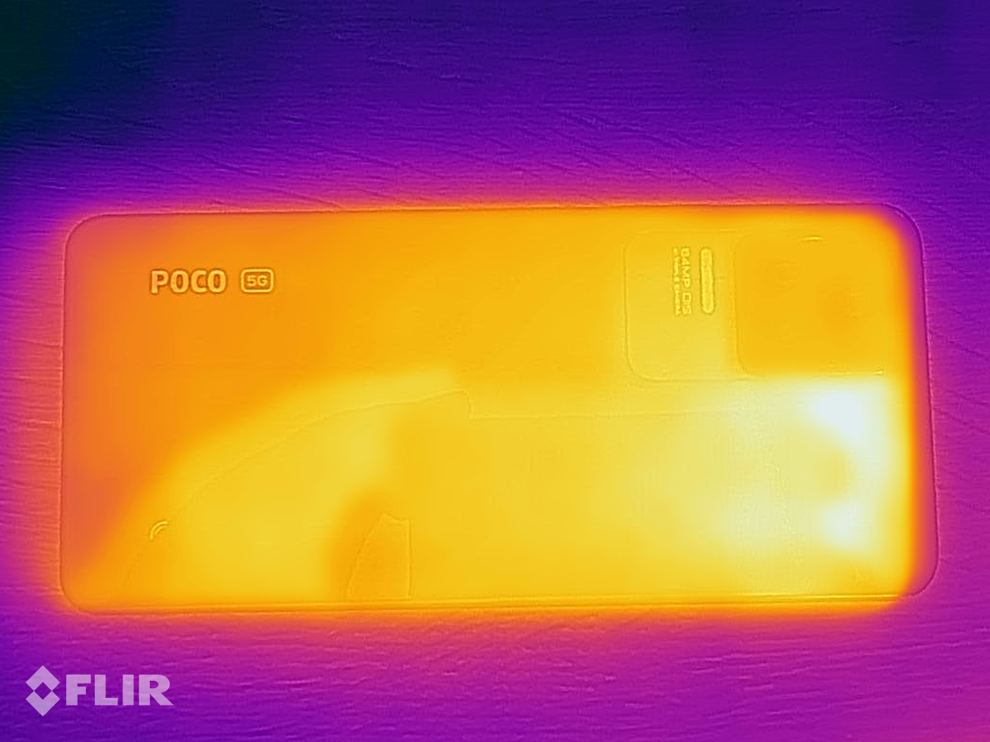 De Poco F4 blijft zowel aan de voor- als achterkant aangenaam koel tijdens dagelijks gebruik. Zelfs onder belasting, zoals tijdens gaming of stresstests, worden alleen individuele gebieden van de smartphone een beetje warmer, vooral in het gebied naast de camera. Over het geheel genomen wordt de Poco nooit warm en kan dus altijd zonder ongemak worden vastgehouden. De fabrikant stelt dat een zevenlaagse grafietstructuur, in combinatie met een 3,1 mm² verdampingskoelkamer, verantwoordelijk is voor het temperatuurbeheer van de chip. Dit systeem werkt in de praktijk goed en koelt deSnapdragon 870 betrouwbaar.