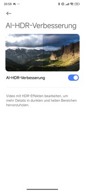 De situatie is anders met de "AI image engine". De resolutie van video's kan door AI worden verhoogd, net als de berekening van extra beelden voor vloeiendere video's. Video's kunnen ook achteraf bewerkt worden met HDR-effecten. Deze functies kunnen al worden geactiveerd, maar AI-beeldverbetering verschijnt wel in de instellingen, maar kan niet worden geselecteerd.