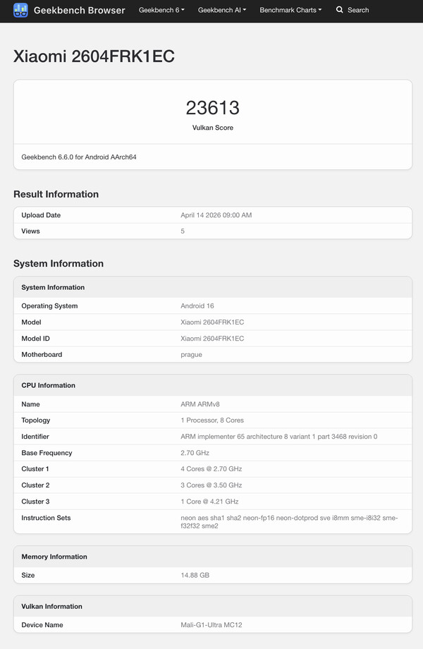 Ondertussen zijn de CPU-prestaties op hetzelfde niveau als wat we gewend zijn van de Dimensity 9500 en zijn octa-core chipset. Vandaar dat de Redmi K90 Max het opneemt tegen moderne vlaggenschepen zoals de Galaxy S26 Ultra, Xiaomi 17 Ultra en de OnePlus 15 (momenteel $899 op Amazon). Geekbench geeft aan dat Xiaomi van plan is om de Redmi K90 Max ook met maximaal 16 GB RAM aan te bieden.