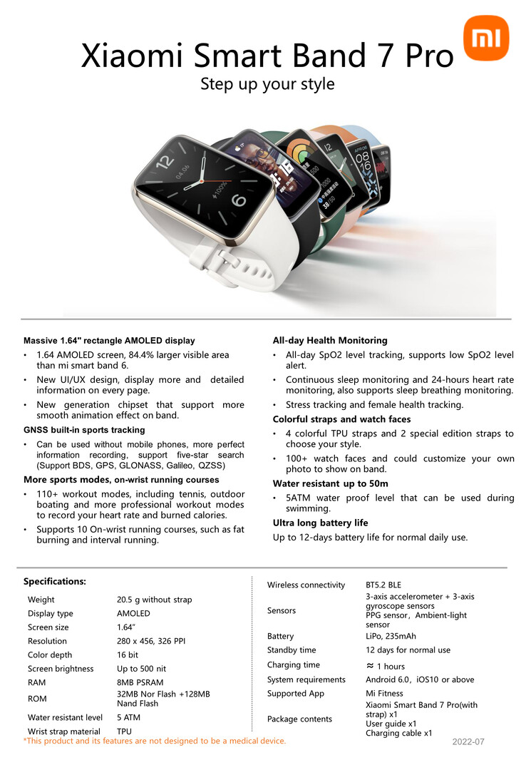 Daarnaast heeft de Smart Band 7 Pro een 235 mAh batterij die volgens Xiaomi tot 12 dagen meegaat tussen oplaadbeurten, of 6 dagen als je alle functies continu gebruikt. Een van die functies is GPS, dat gegevens kan leveren tijdens sommige van de 110+ sportmodi van het apparaat. Ook de Smart Band 7 Pro is tot 5 ATM waterdicht en heeft meer dan 150 voorgeïnstalleerde wijzerplaten, plus een keuze uit zwarte en ivoorkleurige kastkleuren.