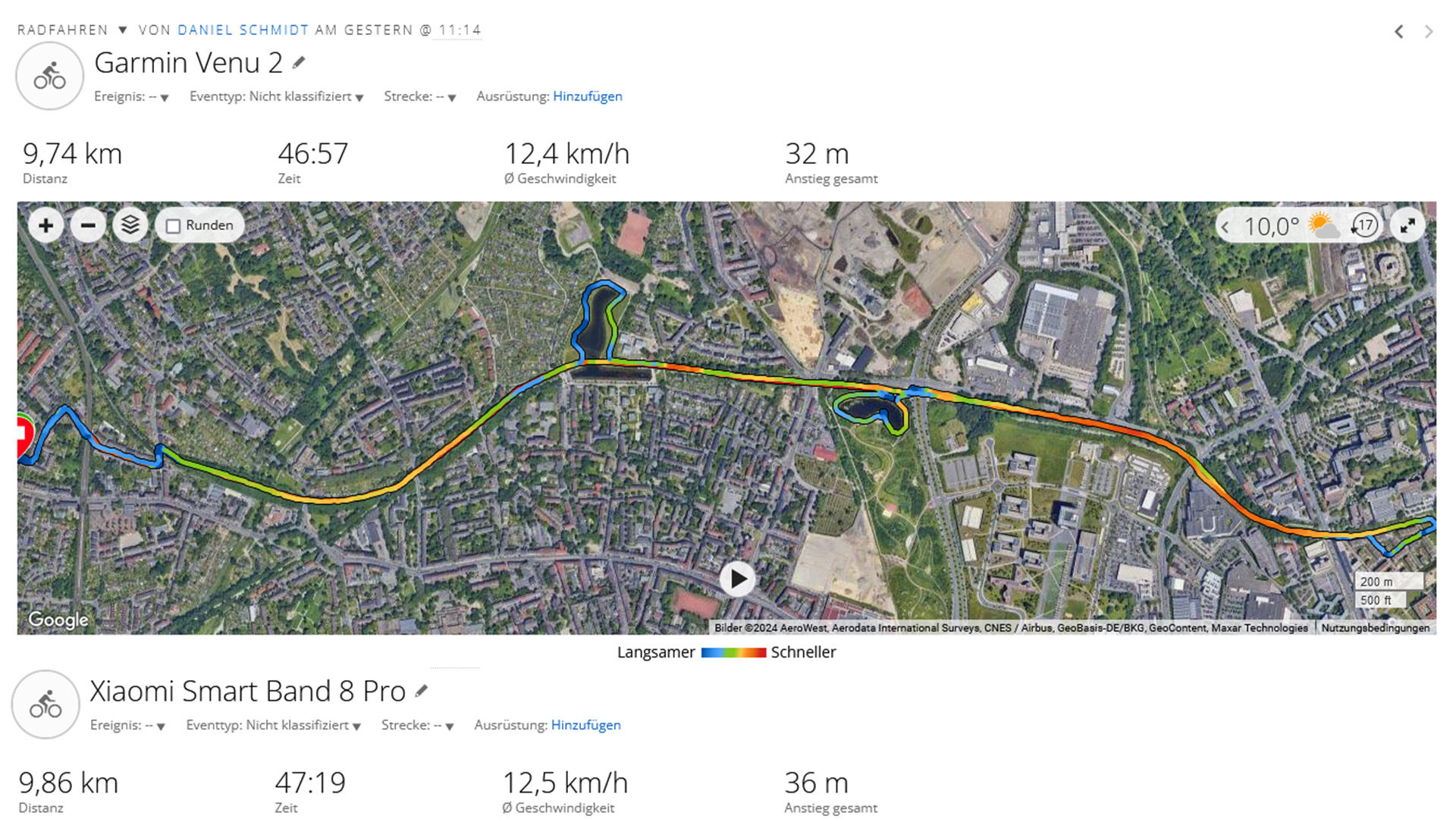 We hebben de Smart Band 8 Pro samen met een Garmin Venu 2 meegenomen op een fietstocht. Het werd duidelijk dat de Smart Band 8 Pro problemen heeft met lokalisatie, vooral in de bebouwde kom. De opgenomen track komt niet overeen met de paden.