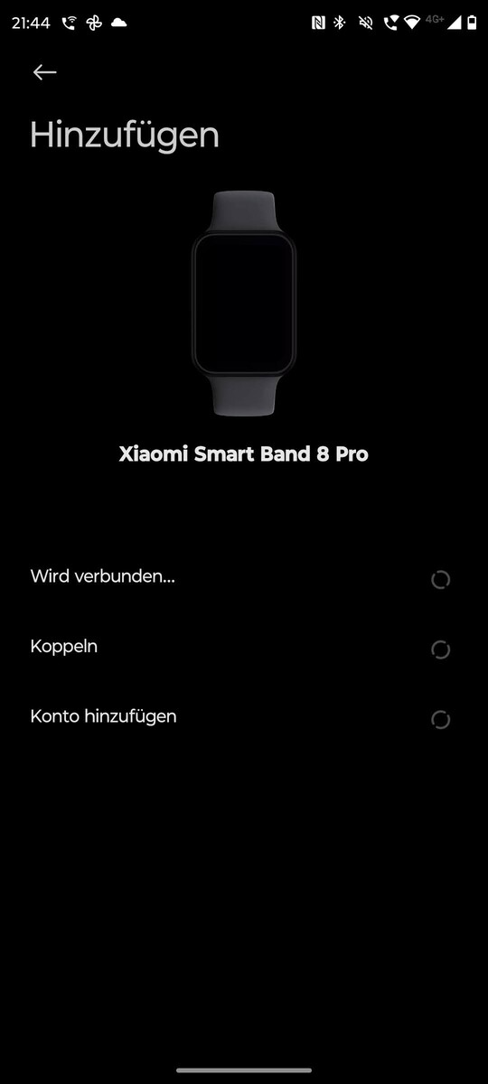 De Mi Fitness app moet geïnstalleerd worden om de tracker in te stellen en te bedienen. Na de installatie en voordat u naar apparaten zoekt, vraagt de app u om in te loggen met een Xiaomi-account. De Smart Band 8 Pro wordt dan snel gevonden en verbonden.