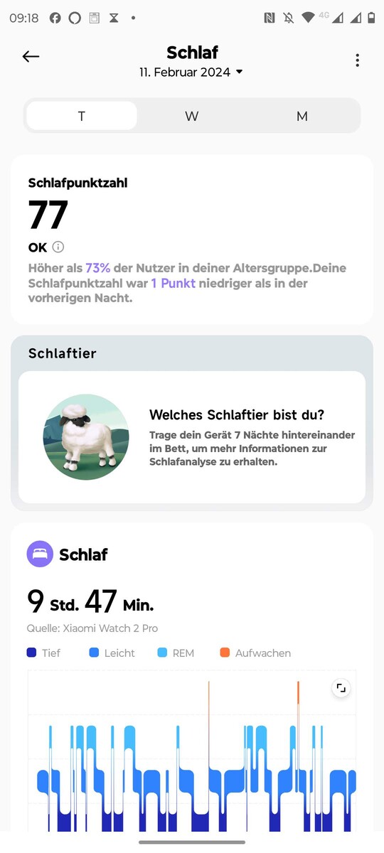 De slaaptracking van de Xiaomi Watch 2 Pro is uitgebreid. De smartwatch meet tijden voor lichte, diepe en REM-slaap. Waaktijden worden ook betrouwbaar gedetecteerd. De verschillende fases worden grafisch weergegeven op een tijdlijn. De software geeft ook tijden en percentages voor elke slaapfase weer.