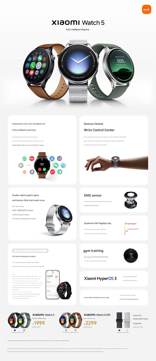 De Xiaomi Watch 5 meet 47 mm en heeft een 1,54 inch AMOLED-scherm met een resolutie van 480 x 480 pixels en een helderheid van 1.500 nits. De wearable wordt aangedreven door de Qualcomm W5-chipset en een 930mAh batterij, die naar verwachting een batterijlevensduur van 6 dagen biedt in de prestatiemodus.