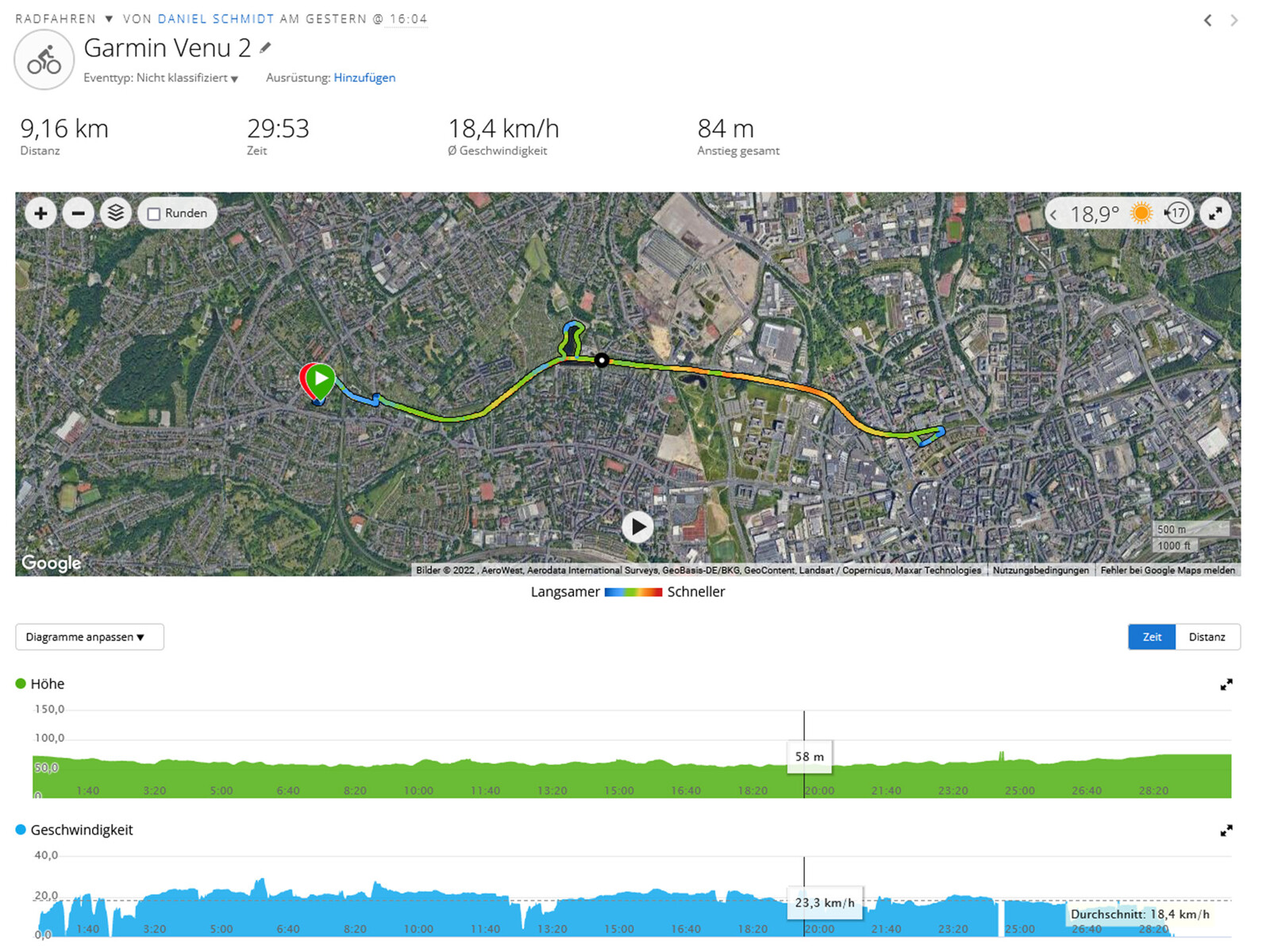 Xiaomi's sport smartwatch moest het tijdens een fietsronde opnemen tegen de Garmin Venu 2 (ca. 310 Euros/~$311 op Amazon) als referentiemodel. De verschillen zijn klein. Terwijl de Venu 2 een totale afstand van 9,16 km bij een gemiddelde snelheid van 18,4 km/h (~5,69 mi bij 11,4 mph) heeft gemeten, komt de Watch S1 Active tot waarden van 9,12 km en 18,68 km/h (~5,67 mi bij 11,6 mph). We kunnen leven met deze afwijkingen, vooral omdat ze aanzienlijk kleiner blijken te zijn en niet zulke grote uitschieters laten zien als op de Xiaomi Watch S1 - hoewel de software en hardware waarschijnlijk identiek zijn