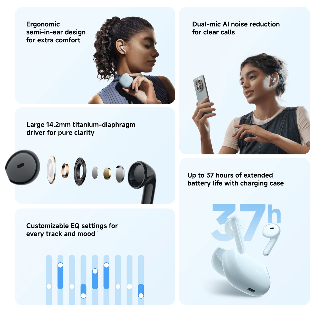 Onder de Redmi Buds 8 Lite in de productlijn van Xiaomi, heeft de Redmi Buds 8 Active drivers van 14,2 mm met titaniumcoating die een frequentierespons hebben van 20 Hz-20 kHz. Hoewel Xiaomi een aanpasbare EQ heeft toegevoegd, ondersteunen de Redmi Buds 8 Active alleen AAC en SBC Bluetooth codecs zonder actieve ruisonderdrukking (ANC). Toch kunnen de oordopjes bogen op een batterijlevensduur tot 7 uur tussen oplaadbeurten en 37 uur zonder dat de oplader opgeladen hoeft te worden.