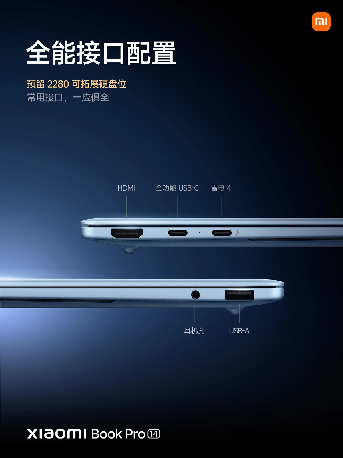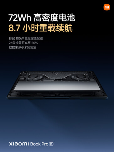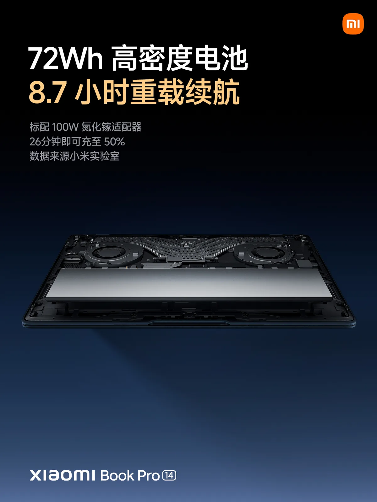 Bovendien installeert Xiaomi een 72 Wh batterij met ondersteuning voor 100 W opladen om het OLED-beeldscherm van 500 nit, 120 Hz en 3.120 x 2.080 pixels van stroom te voorzien. Xiaomi vult dit 3:2 beeldscherm aan met een touchpad van 140 x 93 mm en verlichte toetsen met een toetsaanslag van 1,3 mm. De Book Pro 14 heeft ook HDMI- en USB Type-A-poorten van volledig formaat, ondanks de slanke afmetingen.