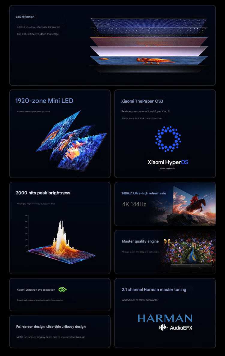 De nieuwste EU-reeksis daarentegen maximaal 98 inch, heeft een piekhelderheid van 1.200 nits en beschikt over 880 dimzones. Daarnaast benadrukt Xiaomi de reflectiearme eigenschappen van de Chinese S Mini LED TV 2026-serie. Er is een "reflectiearme film van 0,5%", wat zou moeten leiden tot een verbeterde kijkervaring in moeilijke lichtomstandigheden.