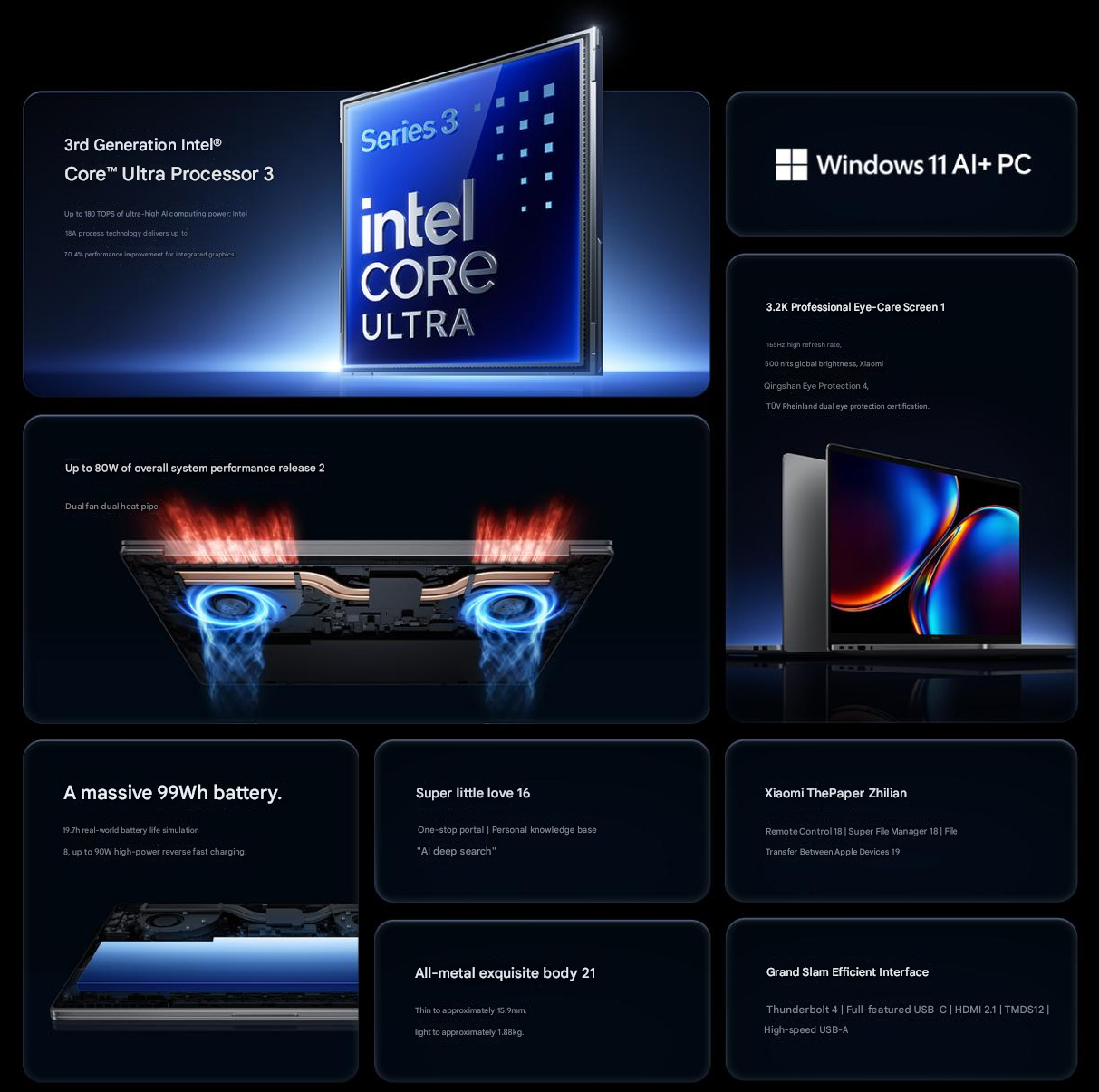 Er zijn drie hoofdconfiguraties beschikbaar voor de twee, en de basisoptie is voorzien van de Intel Core Ultra 5 325, een middenklasse processor uit de lijn. Deze is gekoppeld aan 24GB RAM en 1TB opslagruimte. De tweede configuratie gaat omhoog naar de Core Ultra 5 338H, een meer capabele optie met de Arc B370 iGPU. Xiaomi koppelt deze optie aan 32 GB RAM en 1 TB opslagruimte.