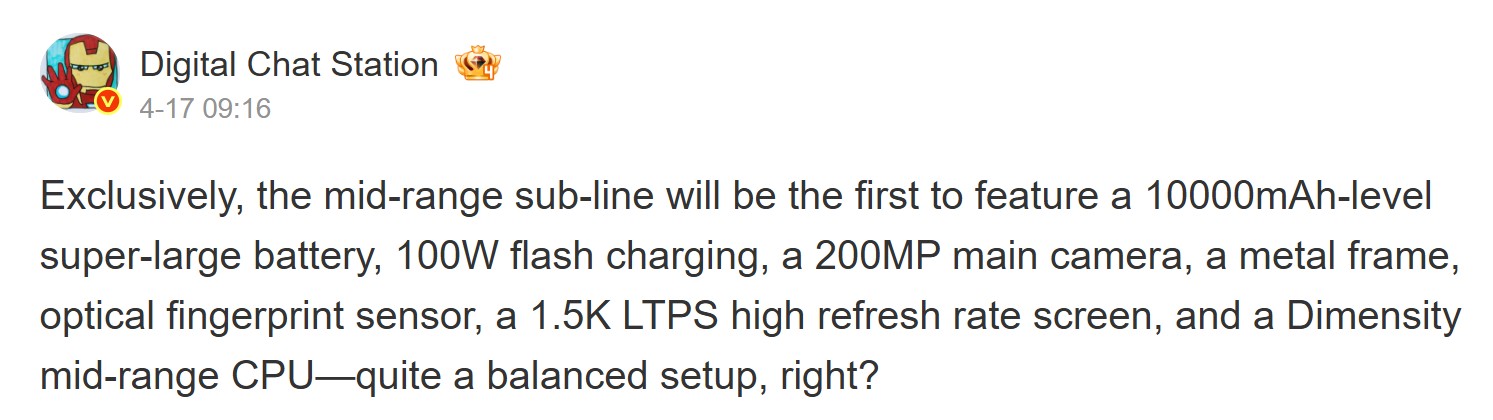 Een ander rapport, van de veelvuldige leaker Digital Chat Station, liet doorschemeren dat de line-up een telefoon met een 10.000mAh batterij zal bevatten. Dit zou een behoorlijke sprong zijn ten opzichte van het maximum van de huidige serie, en de leaker heeft opnieuw iets soortgelijks gemeld.