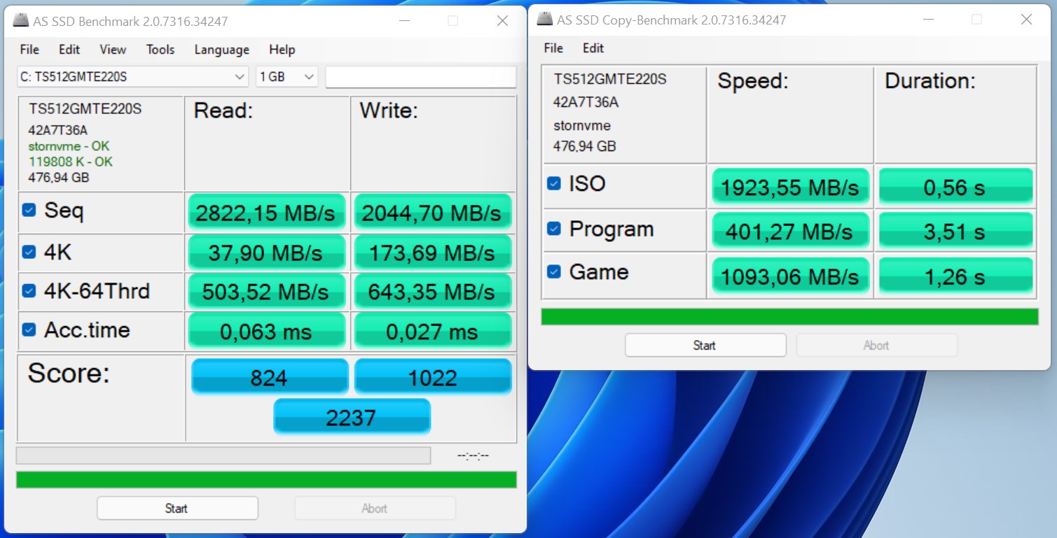 In de applicatie benchmarks zien we een duidelijke prestatieverhoging ten opzichte van de Zotac ZBOX Magus EN72080V. De nieuwere SoC en de aanzienlijk snellere grafische kaart zorgen samen voor het goede resultaat. Over het geheel genomen is de Zotac ZBOX Magnus EN173070C zelfs iets sneller dan de Intel Dragon Canyon NUC met zijn volwaardige desktop GPU en meer actuele Alder Lake CPU. In de rendertests weet de GeForce RTX 3070 Mobile de beslissende punten te behalen ten opzichte van de GeForce RTX 3060. Als je er subjectief naar kijkt, zijn de snelheden in het dagelijks gebruik erg goed. Of je nu op het internet surft, video's bekijkt of games speelt, de Zotac ZBOX Magnus EN173070C beheerst al deze taken zonder problemen. Voor deze review hebben we de mini PC uitgerust met 32 GB DDR4-RAM en twee 512-GB SSD's. De modellen van Transcend leveren een solide prestatie. Je kunt er echter nog een paar procentpunten uitpersen wat betreft de prestaties door nog snellere SSD's te gebruiken. In de behuizing passen maximaal drie opslagoplossingen. Naast de twee M.2-aansluitingen die niet alleen beperkt zijn tot 80 mm lengte, kun je ook een 2,5-inch schijf installeren.