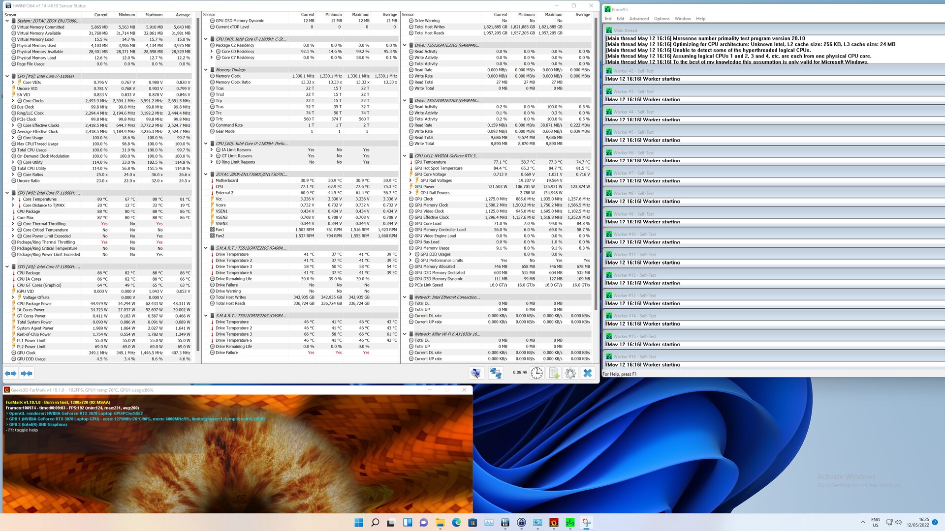 Tijdens de stresstest hebben we het systeem het zwaarst belast met Prime95 en FurMark. Tijdens dit slechtst denkbare scenario, heeft de Intel Core i7-11800Heen maximale temperatuur van 88 °C (190 °F). In de grafische kaart meten we een iets lagere waarde van 77 °C (171 °F). De kloksnelheid van de CPU is 2,6 GHz, wat hoger is dan de basiskloksnelheid van 2,3 GHz. De constante belasting van alle componenten heeft geen negatief effect, en een 3D benchmark direct daarna levert een identiek resultaat op vergeleken met de koude start.