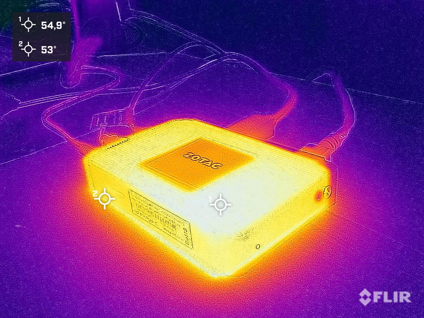 Het stroomverbruik van de Zotac ZBOX PI336 pico is zeker een van zijn sterke punten. Dankzij de efficiënte SoC blijft het stroomverbruik tijdens inactieve werking aanzienlijk lager dan 10 watt. Zelfs onder belasting laat ons meetapparaat slechts een maximum van 11,8 watt zien. De voeding is in staat om tot 20 watt te leveren.