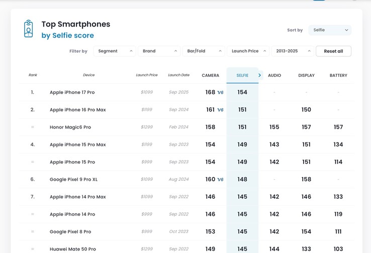 In een gedetailleerde analyse van DxOMark heeft deze upgrade duidelijk zijn vruchten afgeworpen, want de iPhone 17 Pro scoort 154 punten in de selfie-camerareview en neemt de toppositie in op de ranglijst. Apple het nieuwe vlaggenschip heeft een voorsprong op de iPhone 16 Pro en Honor Magic6 Pro, die beide 151 punten kregen en nu op de tweede plaats staan, gevolgd door de iPhone 15 Pro met 149 punten en de Google Pixel 9 Pro XL met 148 punten.