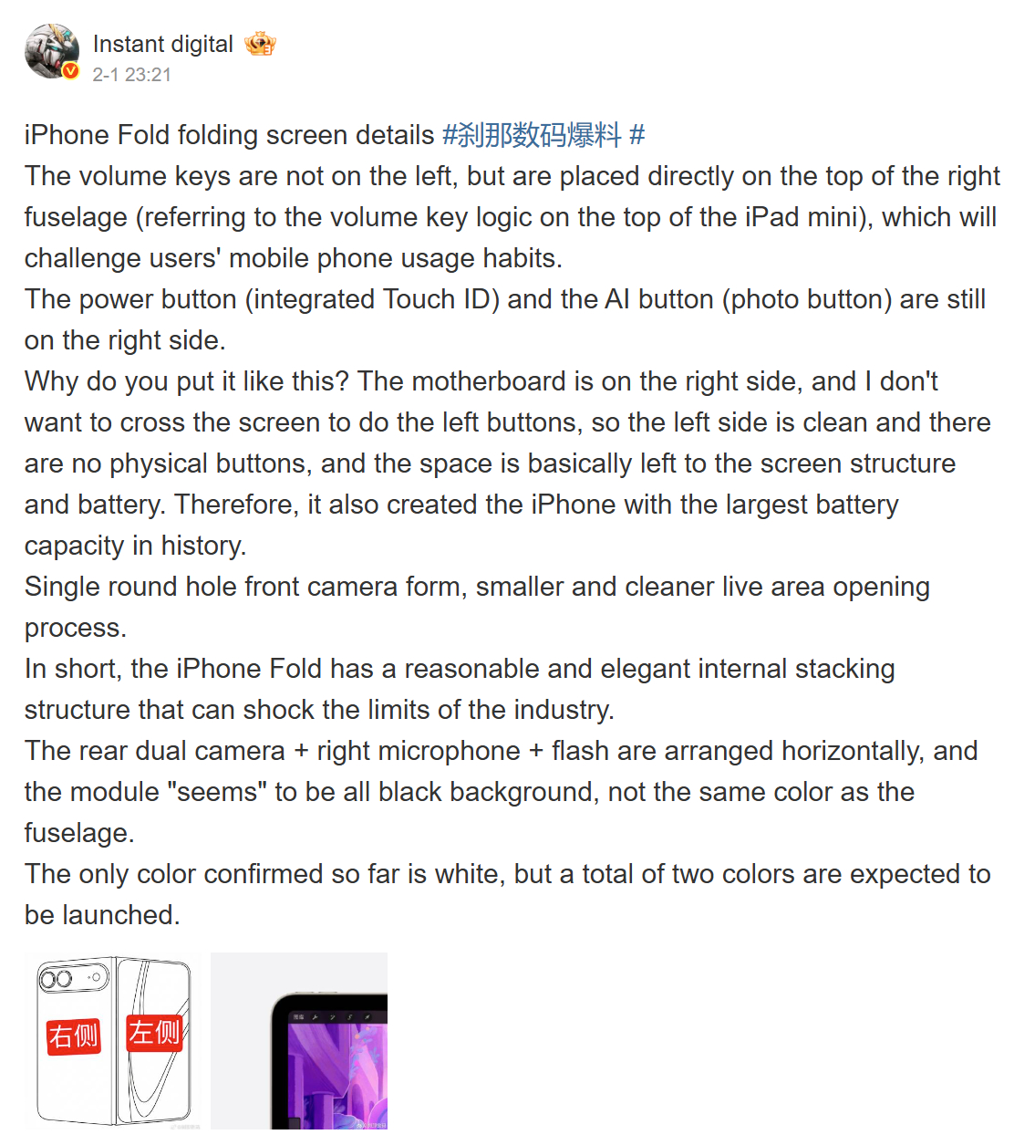 Blijkbaar zal de iPhone Fold de iPad mini nabootsen door alle knoppen aan de rechterkant te hebben, inclusief een Touch ID-bediende aan/uit-knop. Een gestapelde logische printplaat in deze helft zou ook de behoefte aan overtollige bedrading elimineren. Momenteel wordt verwacht dat Apple de iPhone Fold in twee kleuropties zal uitbrengen, hoewel tot nu toe alleen een witte kleuroptie met een 'volledig zwarte' cameramodule bevestigd zou zijn.