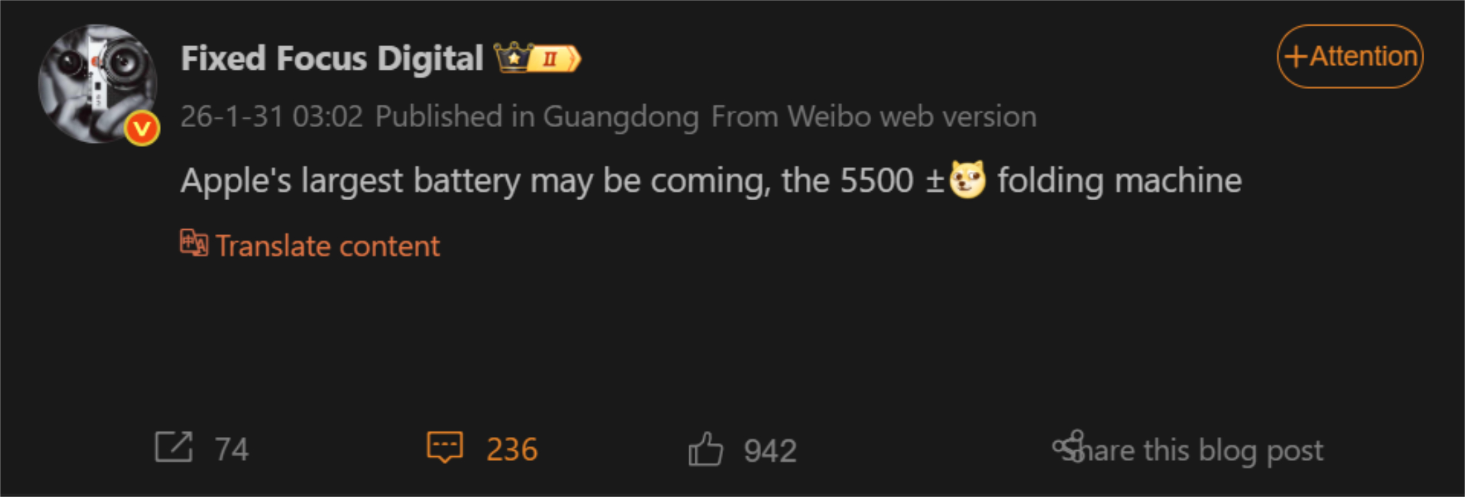Zo liet Fixed Focus Digital zijn volgers onlangs weten dat de iPhone Fold geleverd zal worden met de grootste batterij van alle iPhones tot nu toe. Op Weibo beweerden ze dat de iPhone Fold zal worden geleverd met een batterij van circa 5.500 mah.