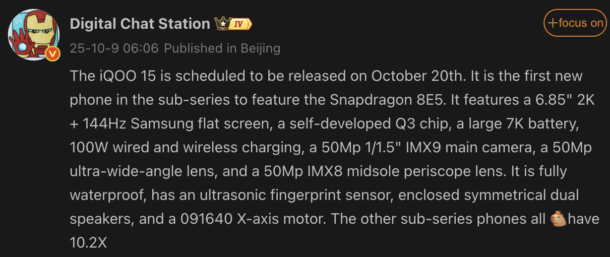 In een bericht op het officiële Weibo account heeft het bedrijf verklaard dat de iQoo 15 op 20 oktober om 19:00 uur plaatselijke tijd in Shenzhen onthuld zal worden. Bovendien onthulde het bedrijf dat het apparaat direct na het evenement in de verkoop gaat. Merk op dat deze lancering specifiek voor de Chinese markt is; de wereldwijde release datum is op het moment van schrijven nog niet bekend gemaakt.