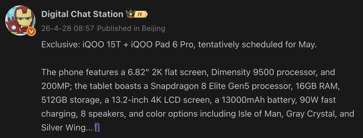 De tipgever suggereert dat de iQoo Pad 6 Pro en iQoo 15T in mei in China op de markt zouden kunnen komen. Apart nieuws: vroege details van de volgende generatie Vivo X500-serie zijn opgedoken.
