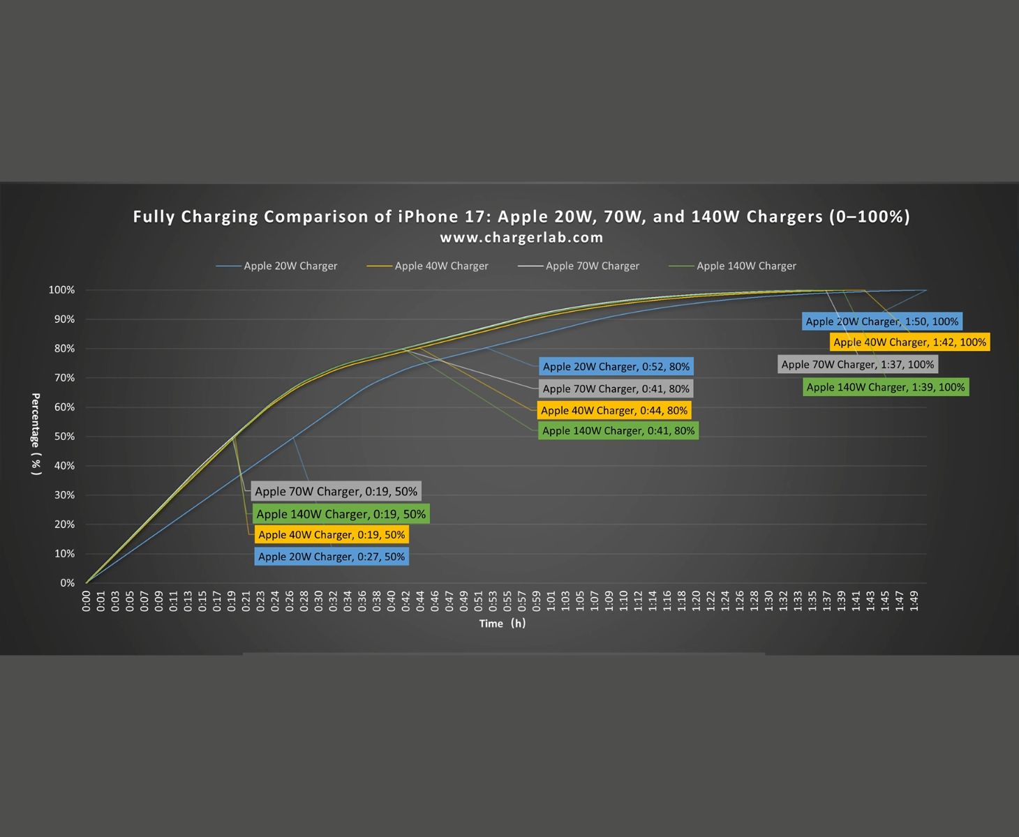 Wanneer de laadcurven voor de 40 W, 70 W en 140 W adapters samen worden uitgezet, lijken ze bijna identiek: de iPhone 17 bereikt 50% in 19 minuten, 70% in 30 minuten, 80% in 41 minuten en volledig opgeladen in 1 uur en 39 minuten.