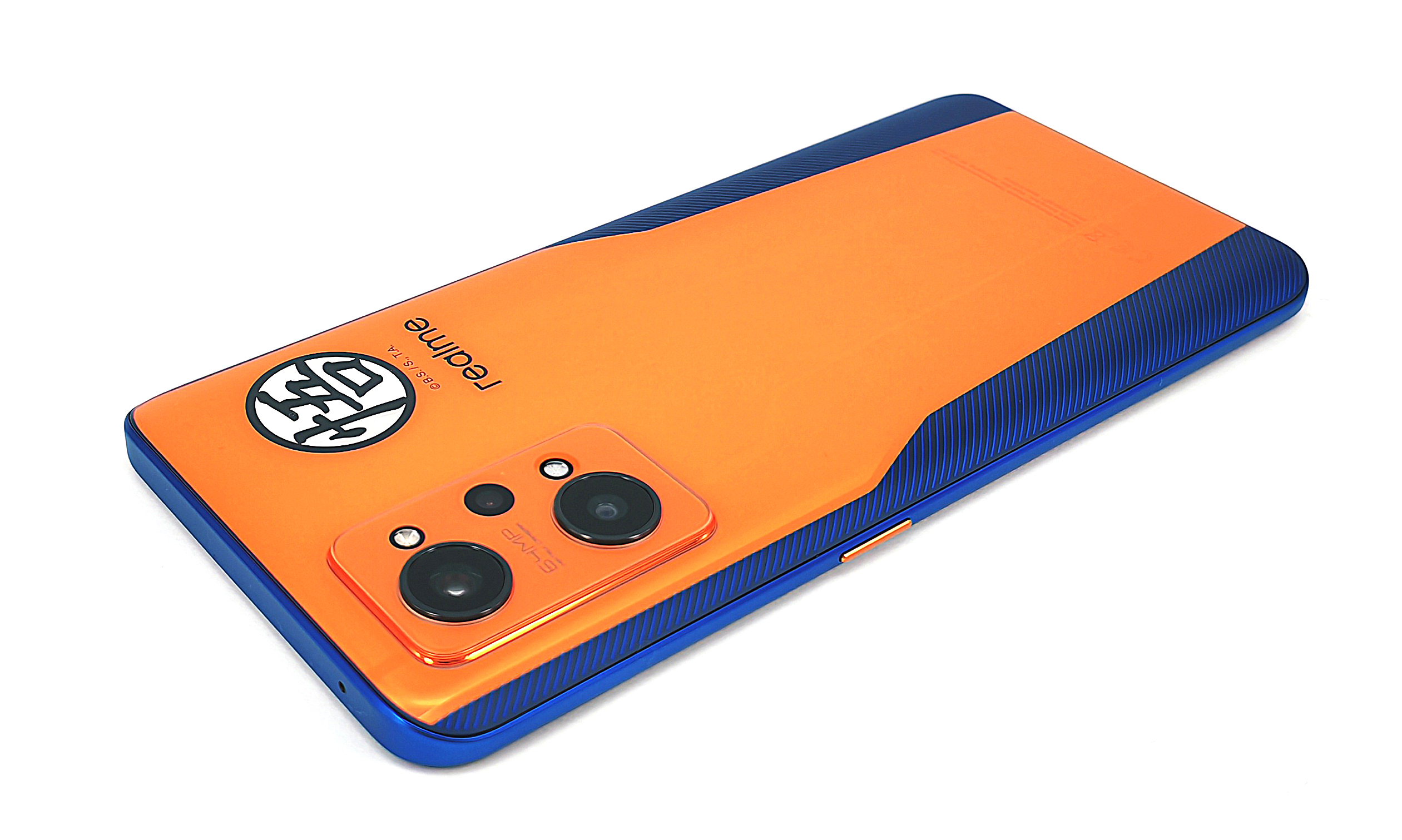 Zoals eerder vermeld, verveelt het niet als het op kleurkeuze aankomt: Ons recensie-exemplaar is de "Dragon Ball Z"-editie, die alleen in visuele details verschilt van de standaardversie van de GT Neo 3T: Een oranje achterkant met een logo en blauwe zijkanten geven de smartphone een unieke look. De telefoon heeft ook een speciaal ontwerp voor de gebruikersinterface in anime-stijl en een speciale oplaadanimatie.
